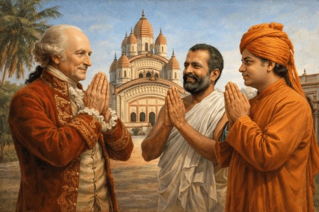 Imaginary image of Warren Hastings, Sri Ramakrishna and Swami Vivekananda greeting each other with Namastes, standing outside the Dakshineswar Kali Temple